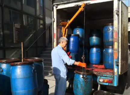 這些廢油被盛放在油桶內(nèi),飯店工作人員把油桶搬運(yùn)到后門(mén)挨著的馬路上后,回收公司的司機(jī)再操控車(chē)上安裝好的車(chē)載吊運(yùn)機(jī),把一桶桶油吊裝到貨車(chē)車(chē)廂內(nèi),既省力又無(wú)需直接和廢油桶接觸,干凈衛(wèi)生。